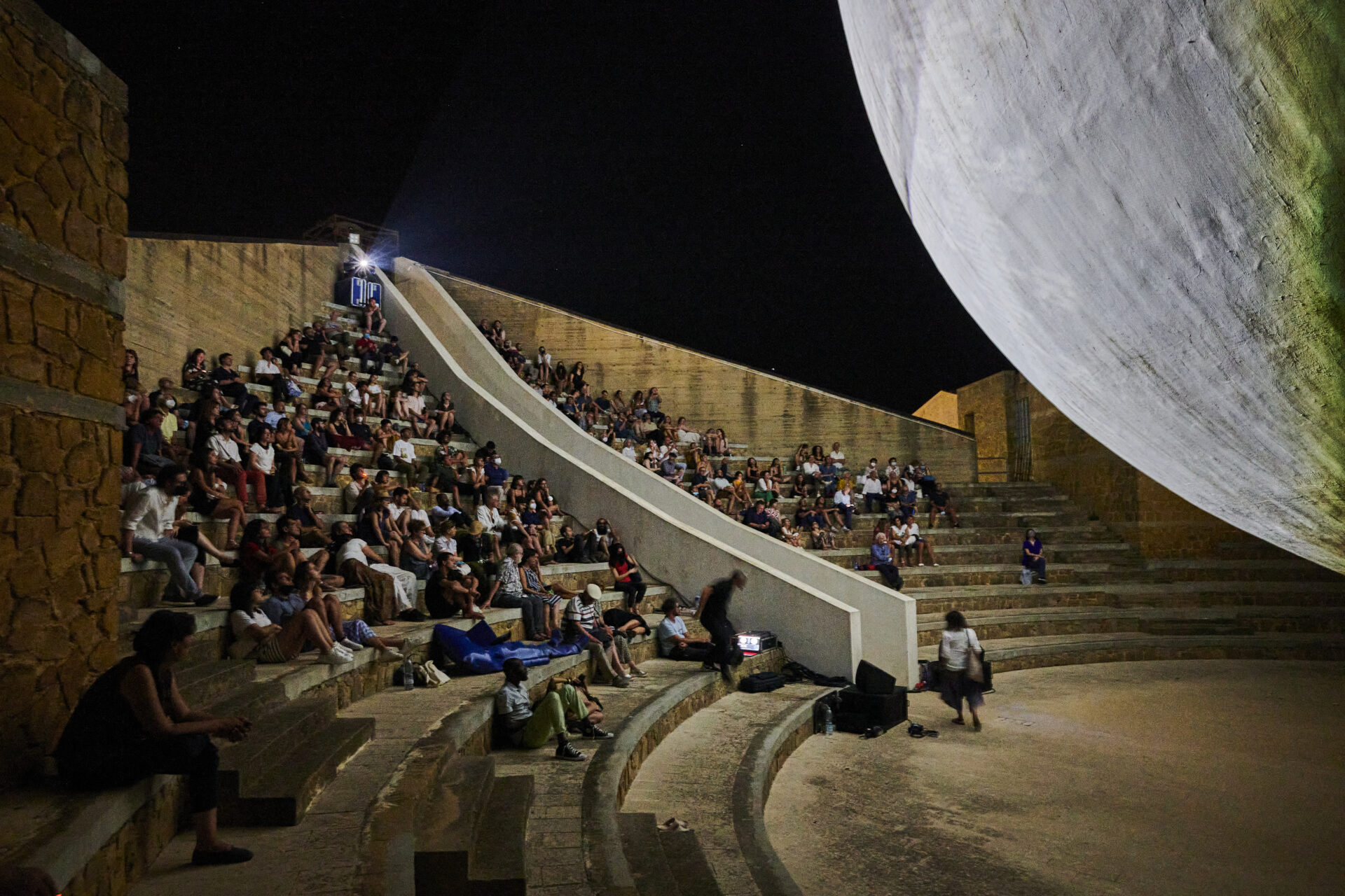 Avec Radial Grammar, Batia Suter transforme un ancien univers de livres en un paysage mental où images et connaissances se métamorphosent. À partir de fragments scannés issus d’encyclopédies et de manuels techniques, l’artiste compose un univers géométrique dominé par la forme de la sphère, évoquant à la fois le noyau originel, le trou noir et l’inconnu qui nous attire autant qu’il nous effraie. Cette matière visuelle, où le microscopique côtoie le colossal, devient une forêt de symboles traversée à l’instinct. À Gibellina, Radial Grammar se déploie sous la forme d’un film projeté en boucle sur l’apside parfaitement sphérique de la Chiesa Madre, créant une expérience immersive où architecture et image fusionnent. Suter y révèle la puissance hypnotique des images lorsqu’elles dialoguent par leur propre logique.