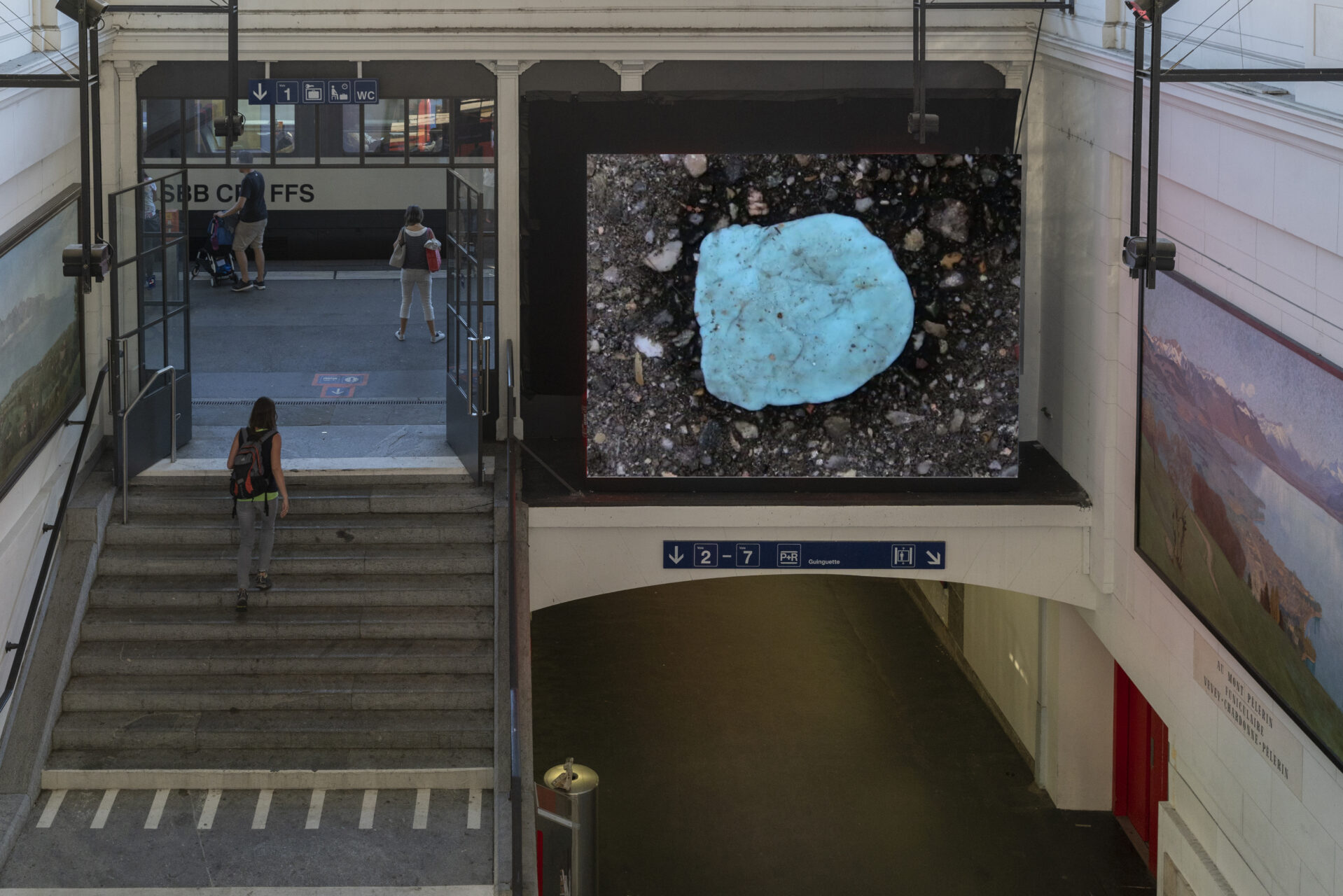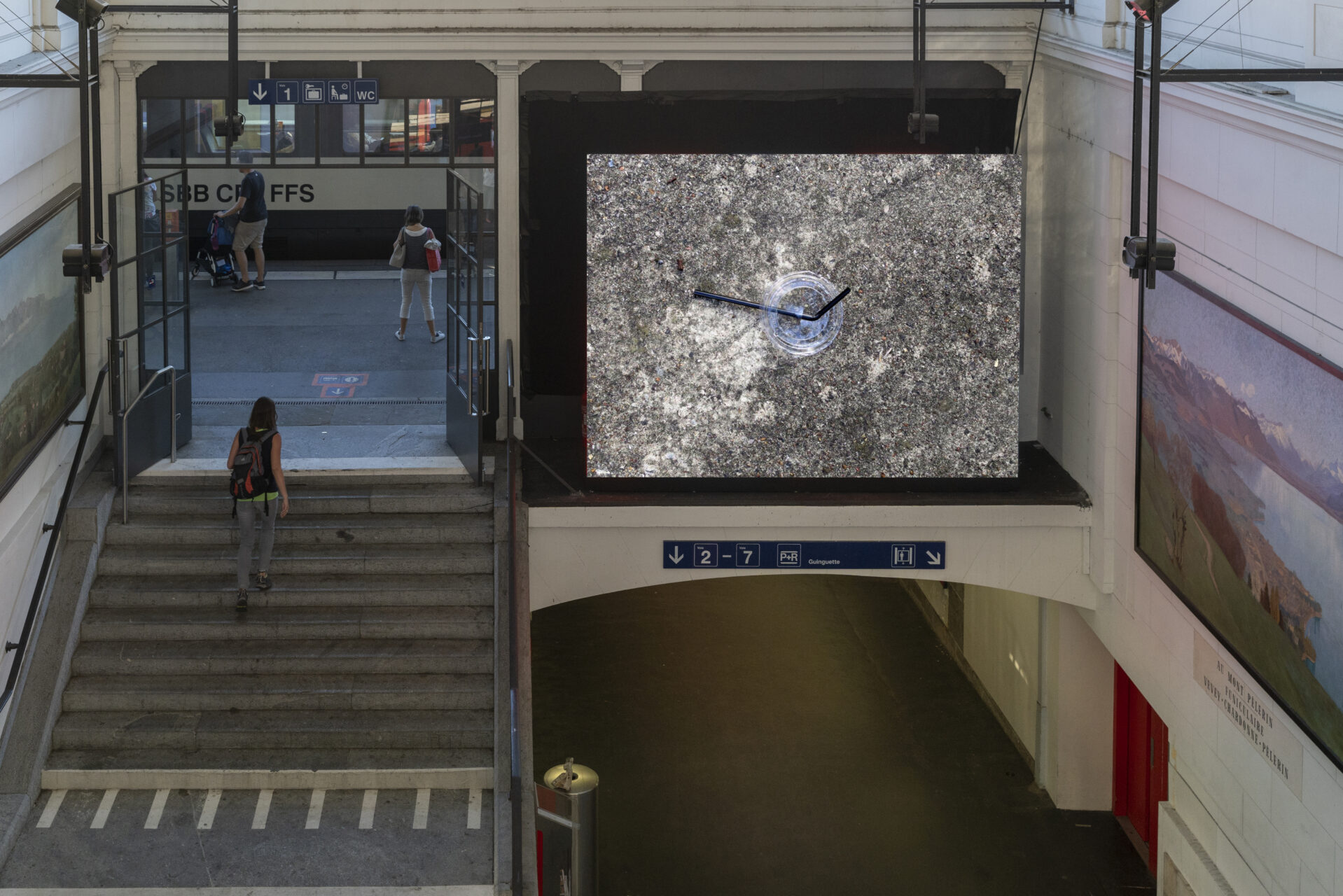 Présentées pour la première fois en Suisse, ces six vidéos de Christian Marclay repoussent les limites du concept de street photography. Au gré de ses promenades londoniennes, le plasticien photographie les objets jetés dans la rue, collectant des milliers d’images de mégots, capsules de bouteilles, chewing-gums, cotons-tiges, couvercles et pailles en plastique. Sous forme de films d’animation silencieux, ces clichés sont restitués à une cadence rapide et créent l’illusion d’un mouvement continu à la manière d’un flip book. Diffusées à raison d’un sujet par jour sur un écran géant dans le hall de la gare ferroviaire de Vevey, ces vidéos invitent les pendulaires à considérer ces objets ordinaires prenant vie de manière extraordinaire.