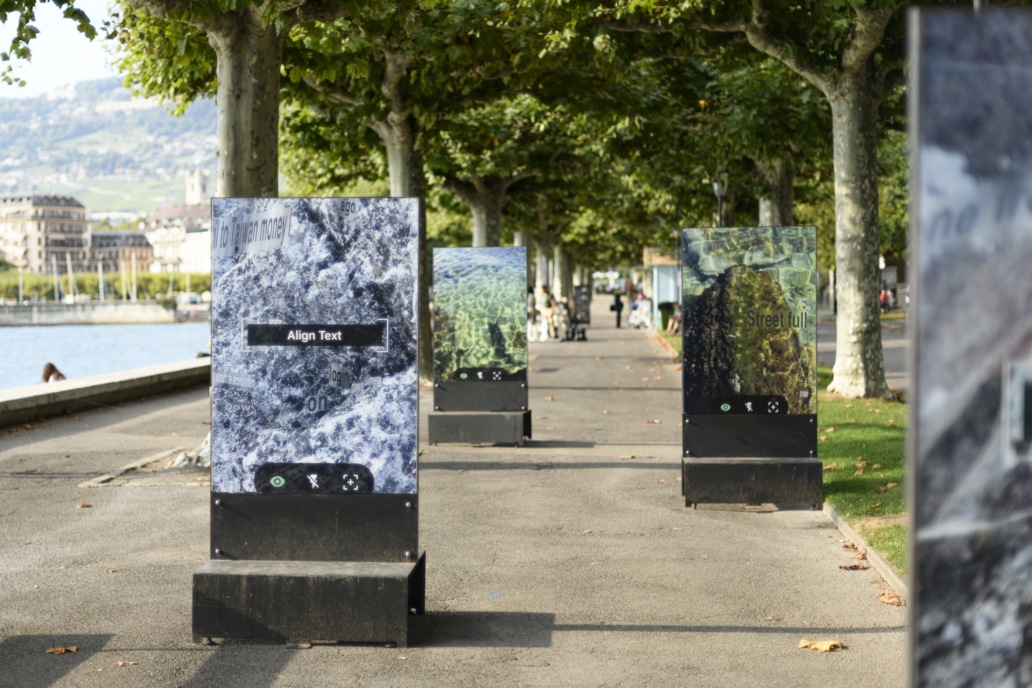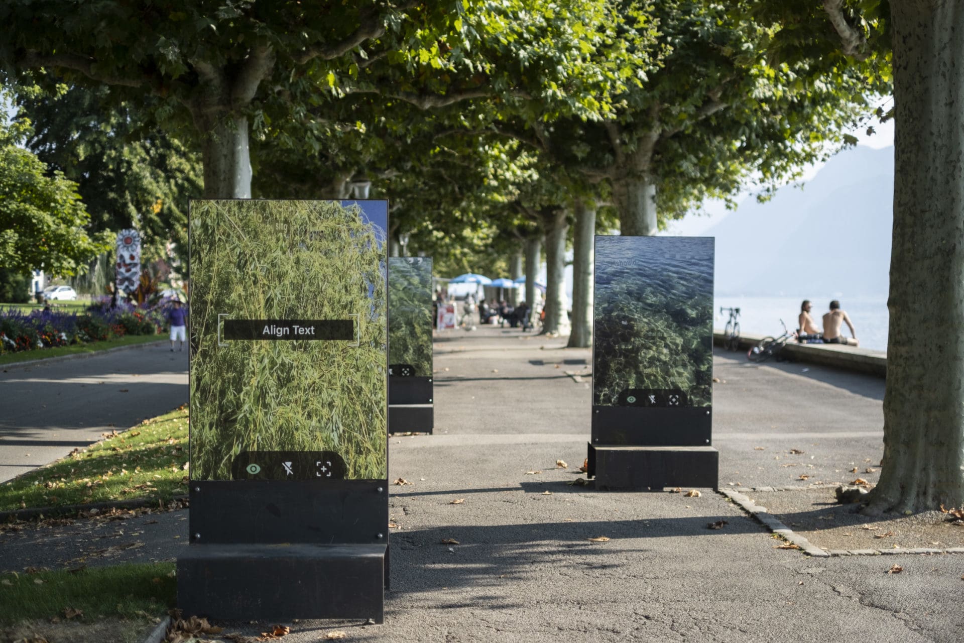 Né au Vietnam et vivant à New York, Duy Hoàng est marqué par son expérience d’immigré. Pour sa série Vestigial Structure, il détourne la fonction “appareil photo” de l’application Google Translate, qui permet de photographier un texte et d’en obtenir la traduction instantanément. En orientant délicatement la caméra de son smartphone vers le lac, les montagnes ou les arbres, il révèle des mots dissimulés dans ces environnements naturels et invisibles à l’œil nu. En fait, les formes dessinées par les mouvements de l’eau ou des branches sont interprétées par l’application comme des idéogrammes asiatiques, et donc des mots. Automatiquement traduits vers l’anglais, les mots ainsi générés de manière aléatoire par l’application apparaissent en parfaite harmonie avec leur environnement. Présentée pour la première fois à l’occasion de la Biennale Images Vevey, cette série a été réalisée lors d’une résidence de l’artiste à La Becque, non loin du lieu de l’installation.