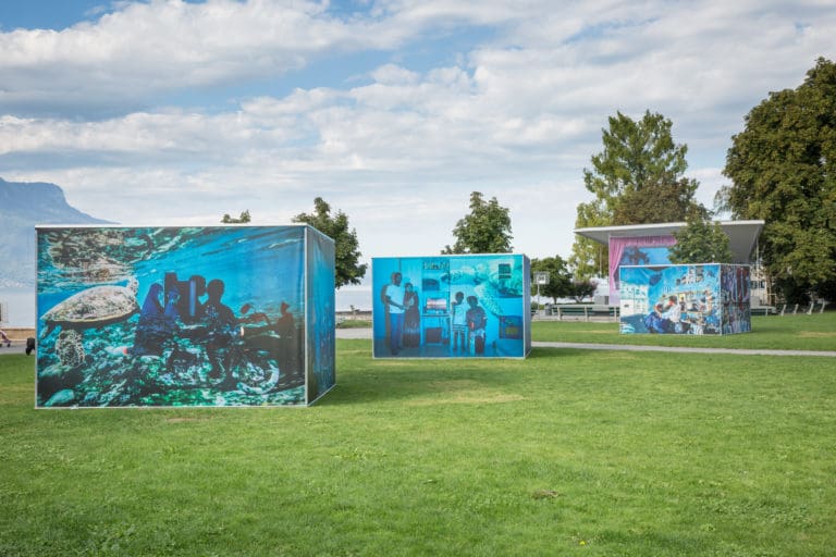Selon les données fournies par les Nations Unies, les Maldives seront l’un des premiers pays à disparaître en conséquence du changement climatique. Au rythme actuel de l’évolution, cet archipel de 1200 îles pourrait déjà être submergé à 80% d’ici à 2050. L’urgence de cette situation conduit les autorités à envisager des solutions d’exil pour sa population sur des terres d’accueil lointaines. La série Diving Maldives illustre cette réalité difficile à imaginer de manière tout à fait inattendue et suggestive : le couple d’artistes a rassemblé une collection de photographies sous-marines prises par des touristes pratiquant la plongée. À l’aide d’un projecteur, ils ont ensuite projeté ces images sur les murs des lieux fréquentés par la population autochtone. Les Maldivien·ne·s prennent la pose tout en sachant qu’il·elle·s seront forcé·e·s à un exil écologique inévitable.