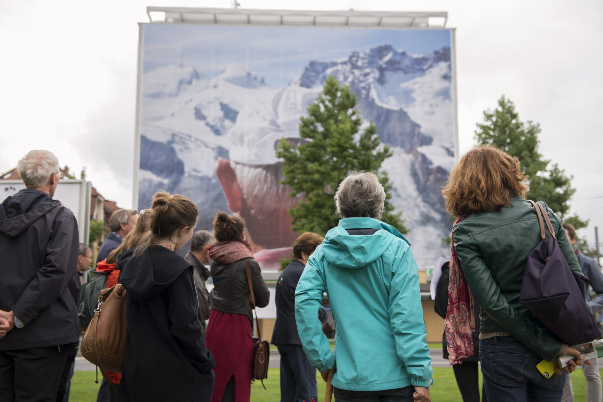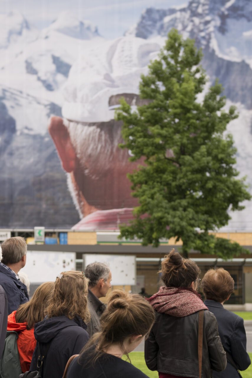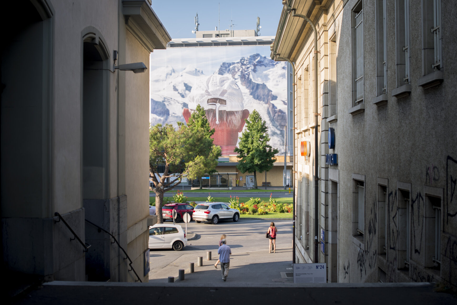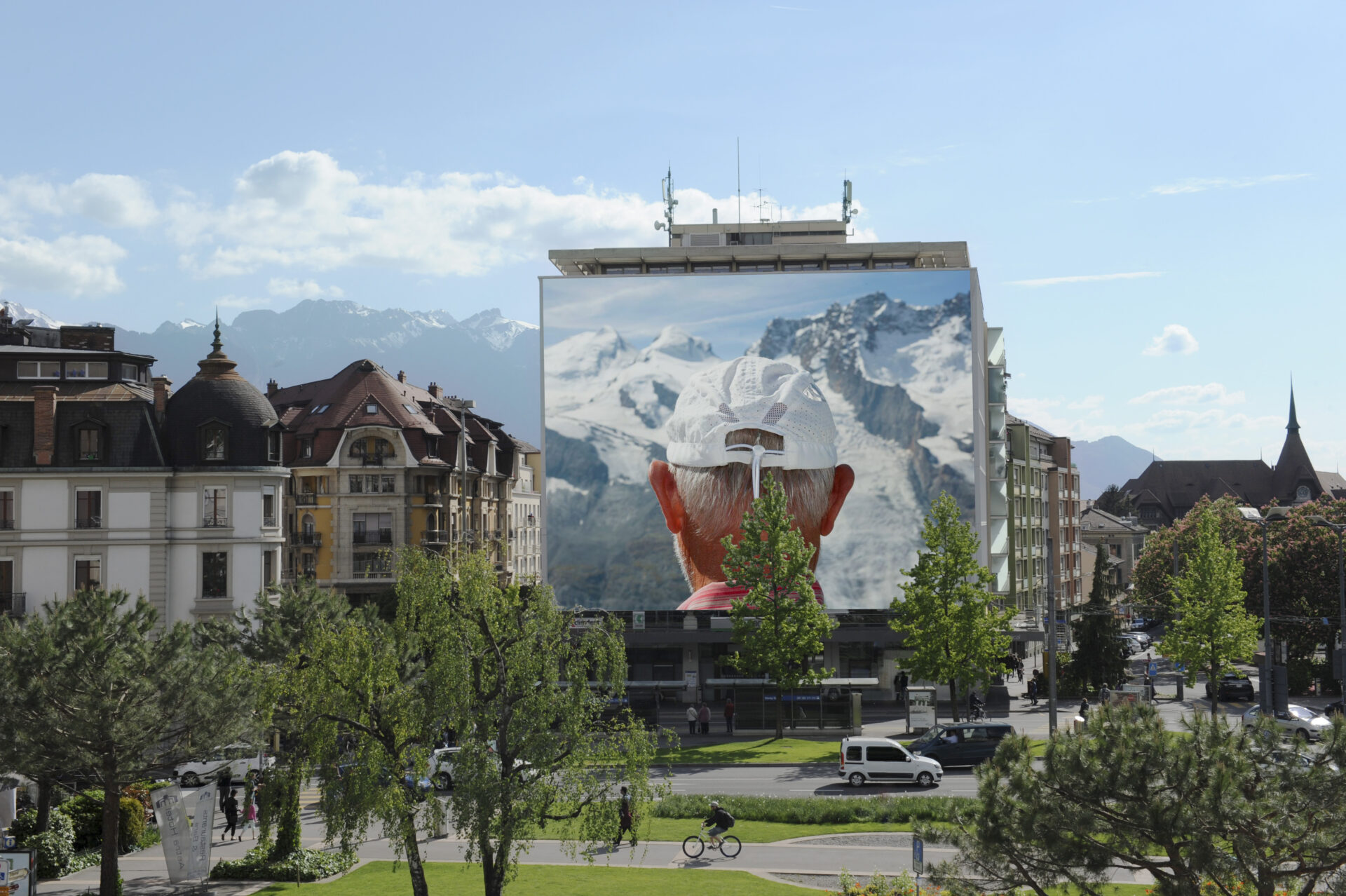 Depuis quarante ans, l’incontournable Martin Parr livre une vision mordante des travers de la société contemporaine avec en ligne de mire les dérives des loisirs populaires et du tourisme de masse. Tirée d’une série consacrée à la Suisse et à ses nombreux clichés, cette photographie d’un vacancier admirant les montagnes à Zermatt, comme incrusté dans le panorama, est présentée en format monumental sur une des plus grandes façades de la ville. Mesurant plus de 500 m2, l’installation Think of Switzerland est conçue de façon à créer, depuis un point de vue précis, l’illusion de continuité avec le paysage alpin réel apparaissant derrière le bâtiment.