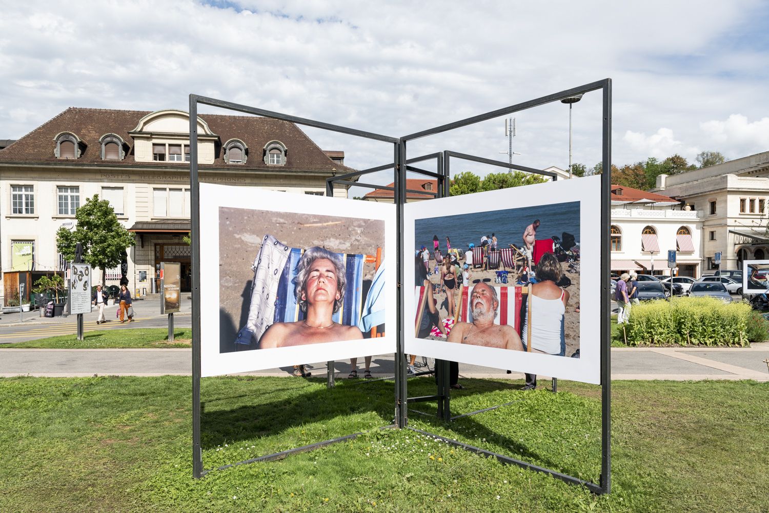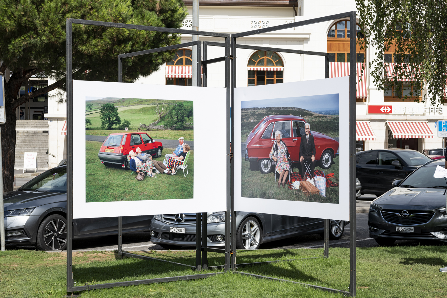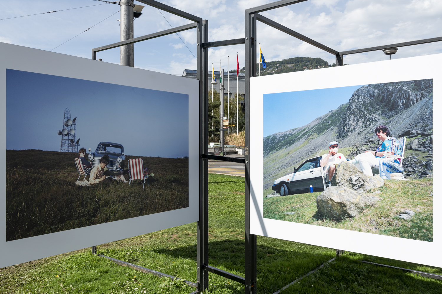 Depuis quarante ans, l’incontournable Martin Parr livre une vision mordante des travers de la société contemporaine avec en ligne de mire les dérives des loisirs populaires et du tourisme de masse. Tirée d’une série consacrée à la Suisse et à ses nombreux clichés, cette photographie d’un vacancier admirant les montagnes à Zermatt, comme incrusté dans le panorama, est présentée en format monumental sur une des plus grandes façades de la ville. Mesurant plus de 500 m2, l’installation Think of Switzerland est conçue de façon à créer, depuis un point de vue précis, l’illusion de continuité avec le paysage alpin réel apparaissant derrière le bâtiment.
