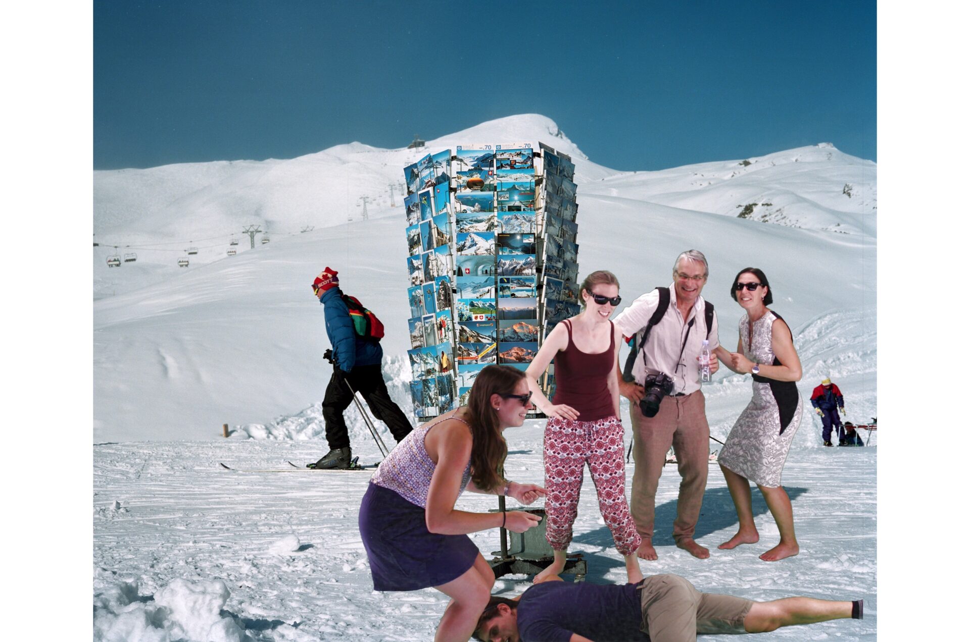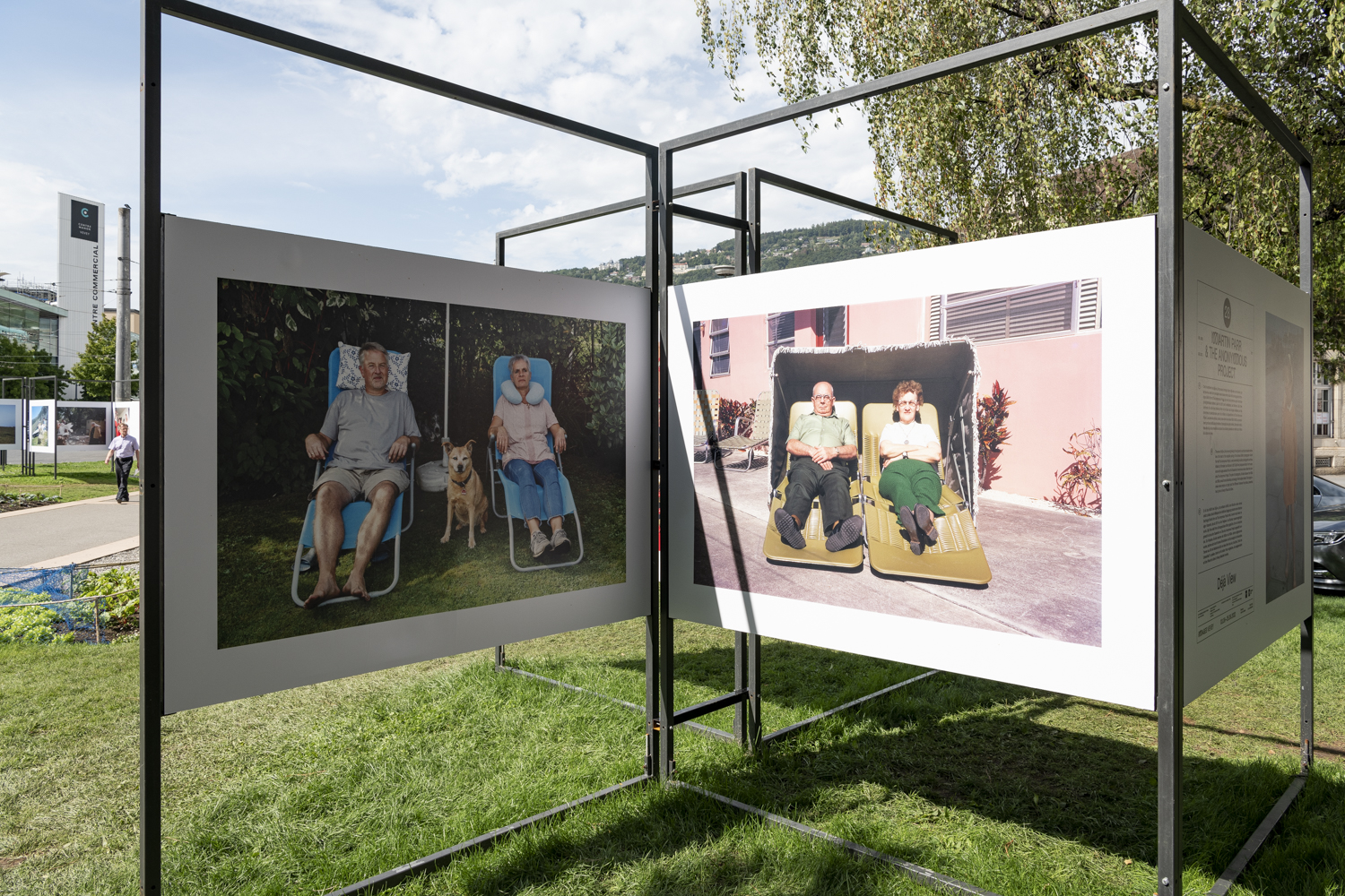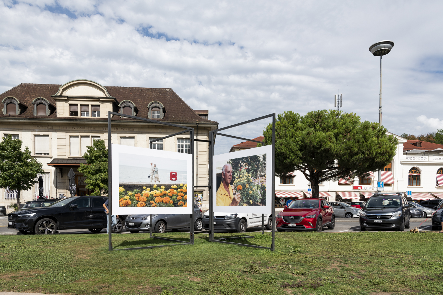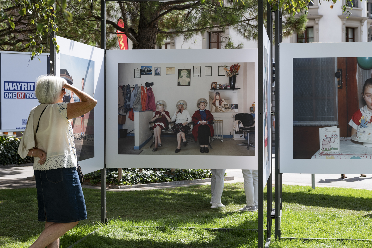 Depuis quarante ans, l’incontournable Martin Parr livre une vision mordante des travers de la société contemporaine avec en ligne de mire les dérives des loisirs populaires et du tourisme de masse. Tirée d’une série consacrée à la Suisse et à ses nombreux clichés, cette photographie d’un vacancier admirant les montagnes à Zermatt, comme incrusté dans le panorama, est présentée en format monumental sur une des plus grandes façades de la ville. Mesurant plus de 500 m2, l’installation Think of Switzerland est conçue de façon à créer, depuis un point de vue précis, l’illusion de continuité avec le paysage alpin réel apparaissant derrière le bâtiment.