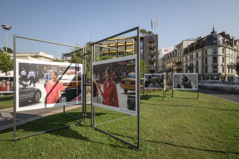 Pour sa série 42nd and Vanderbilt le protocole de prise de vue est toujours identique : même lieu, même heure, mais un autre jour. C’est à un croisement très fréquenté de New York que Peter Funch a braqué son objectif sur des inconnu·e·s entre 8h30 et 9h30 du matin. Formé au photojournalisme, sa pratique relève autant de l’observation sociologique qu’elle emprunte au langage cinématographique. Traquant les habitudes des personnes qu’il repère à plusieurs reprises pendant neuf ans, le photographe illustre le caractère répétitif d’une existence minutée et routinière. Chaque cliché porte la date et l’heure de la prise de vue, confrontant les portraits d’un même individu pris à des jours différents. La série est présentée en face de la gare de Vevey, près d’un carrefour qui s’anime matin et soir, selon le rythme métro, boulot, dodo des pendulaires.