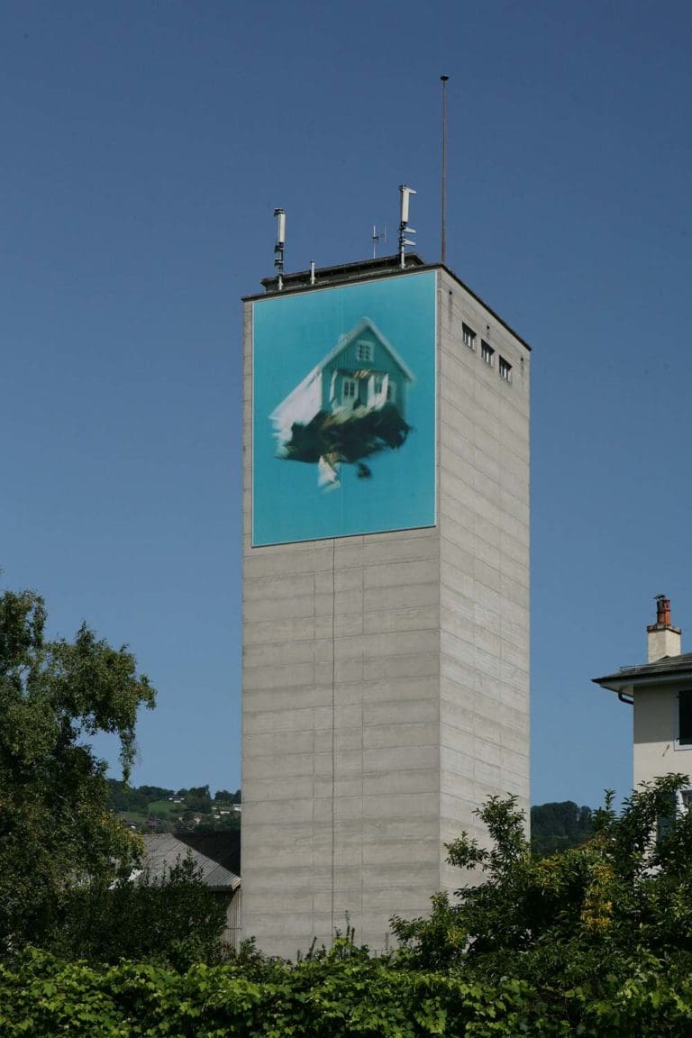 Réalisés à la fin des années 1990, les photomontages hyperréalistes de la série Mobile Homes de Peter Garfield représentent la chute de pavillons de banlieue américaine appelés à s’écraser avec fracas dans l’instant qui suit. Entre apparente tranquillité et catastrophe annoncée, ses images génèrent un sentiment absurde chez le spectateur, tout en l’invitant à s’interroger sur leur sens. Durant la crise des subprimes en 2008, le travail de l’Américain prend une dimension nouvelle à l’occasion de la Biennale Images Vevey, qui présente en extérieur l’une de ses maisons tombant depuis les hauteurs d’un immense silo à grains qui sera bientôt lui-même rasé. En parallèle, le Musée historique de Vevey expose un ensemble de photographies tirées de ses séries Mobile Homes et Harsh Realty ainsi que l’installation vidéo Deep Space 1.