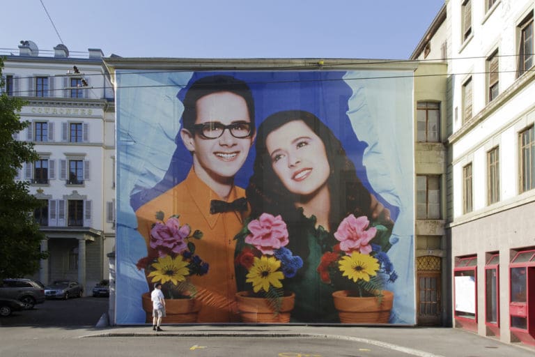Depuis les années 1970, l’esthétique de Pierre et Gilles transporte le spectateur dans un univers coloré et psychédélique où se mêlent imagerie religieuse, burlesque et iconographie gay. Le duo a aussi marqué la culture populaire en concevant des pochettes d’albums pour Boy George, Nina Hagen ou Etienne Daho. Réalisée pour le groupe Mikado, l’œuvre À la fenêtre s’étend sur plus de 110 m2 sur la façade de l’Hôtel des Trois Couronnes et rappelle leur contribution au monde de la musique ; et sur l’ancienne prison de la ville, la pièce Dans le port du Havre, de plus de 140 m2, montre un jeune marin piégé dans une eau trouble jonchée de déchets.