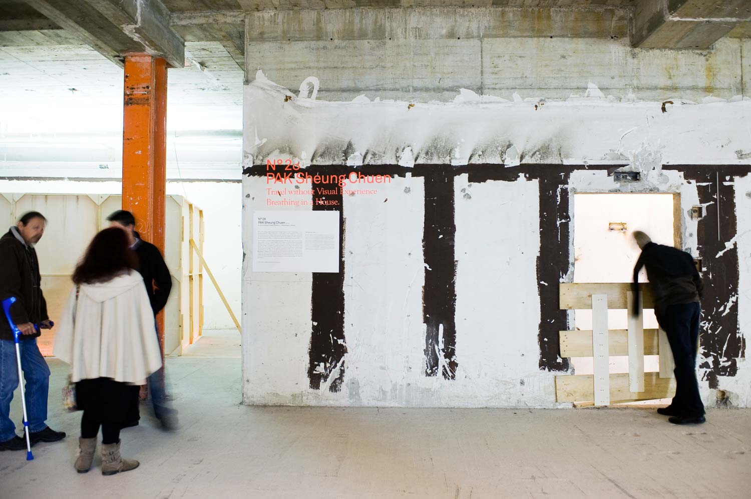 À l’occasion de la Biennale Image Vevey, Sheung Chuen Pak présente deux installations issues de ses performances. Pour A Travel without Visual Experience, le Hongkongais se bande les yeux lors d’un voyage de groupe en Malaisie et immortalise son séjour en prenant des photos. La caméra se substitue alors à sa vision. Plongé dans l’obscurité, le spectateur doit actionner le flash de son appareil pour découvrir pendant une fraction de seconde les photographies exposées. La seconde, Breathing in a House, rend compte des dix jours durant lesquels l’artiste s’est enfermé dans un petit appartement et a collecté tout l’air qu’il expirait dans des sachets plastiques jusqu’à ce qu’ils occupent son espace vital.