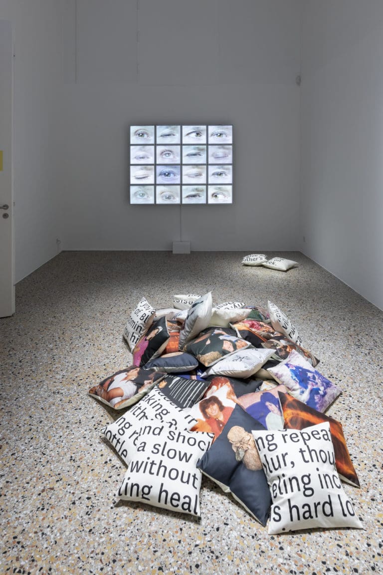 À l’âge de sept ou huit ans, Stefanie Moshammer adresse une lettre à « l’enfant Jésus », équivalent des demandes enfantines au Père Noël, souhaitant que sa mère guérisse de son addiction à l’alcool. Cette lettre constitue le point de départ de Each Poison, A Pillow. Mêlant recherches et souvenirs intimes, l’installation témoigne de l’affection profonde mais fragile qui lie mère et fille. Entre elles se trouve la fameuse lettre ; au sol, un amas de coussins, en référence au titre, évoque à la fois le réconfort recherché par l’alcool et l’espace domestique, où l’alcoolisme des femmes est le plus fréquent. L’artiste viennoise part de son histoire personnelle pour aborder, sans jugement, un sujet dont on parle peu : l’alcoolisme au féminin.