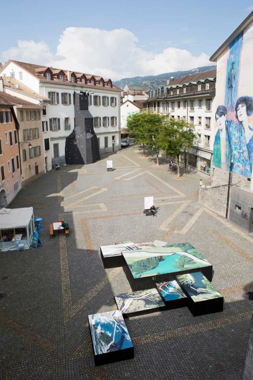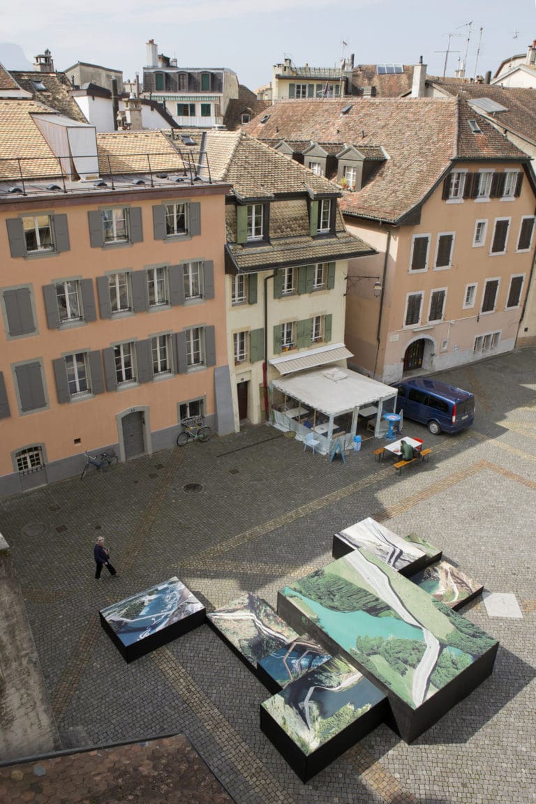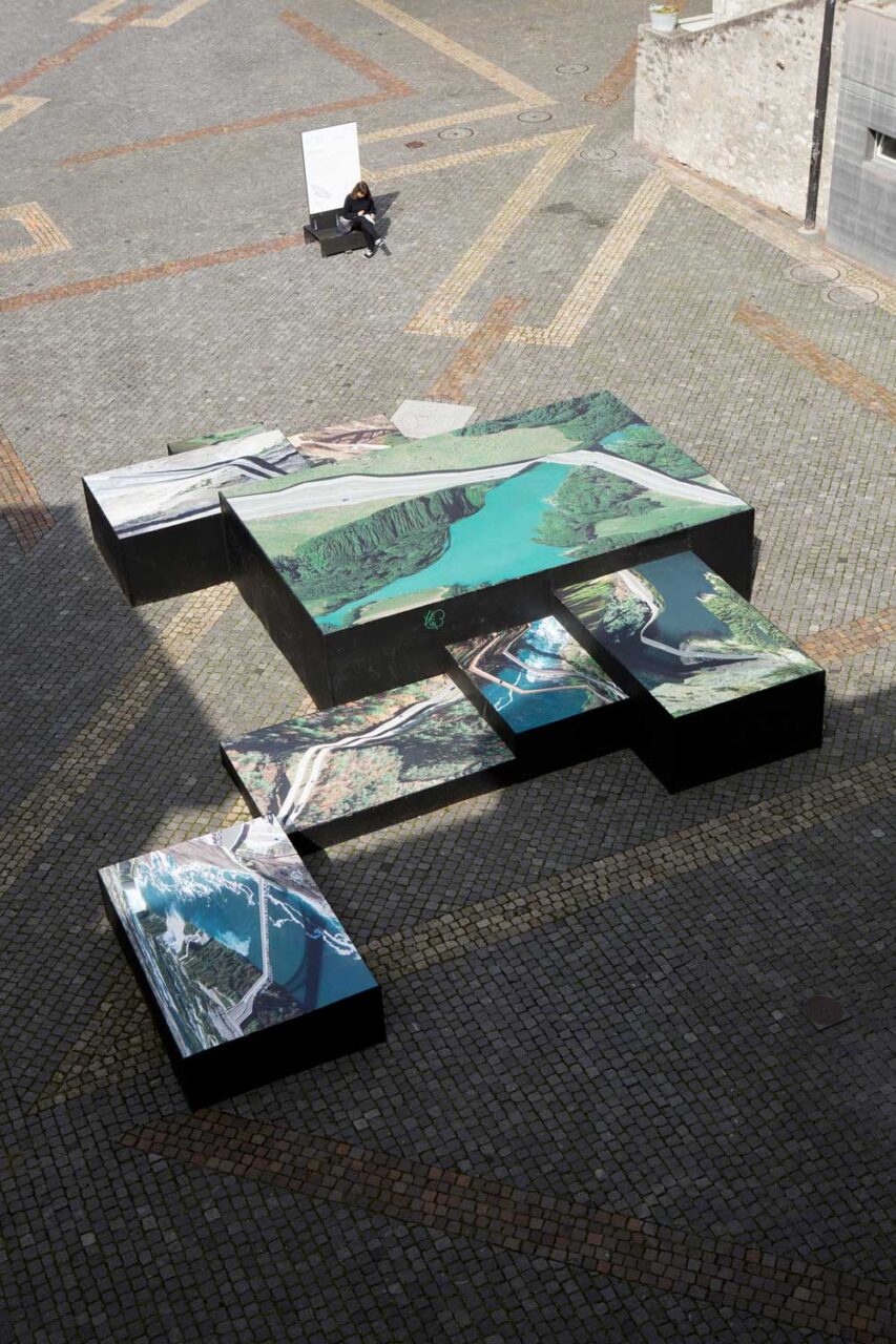 For his Postcards from Google Earth series, Clement Valla collected screenshots of roads, bridges and dams photographed by Google’s satellites. The software is not always able to interpret these tridimensional structures, hence their shape appears deformed and flattened to the Earth’s surface. By presenting a world distorted via the prism of computer algorithms, the artist addresses the inability of such artificial intelligence to reproduce the exact landscape and its constructions. Visitors could walk over the pictures displayed on giant platforms set at different levels, thus giving them the same overhead viewpoint as a satellite. They could then experiment with the discrepancies between reality as seen by the machine and that which the human eye perceives.