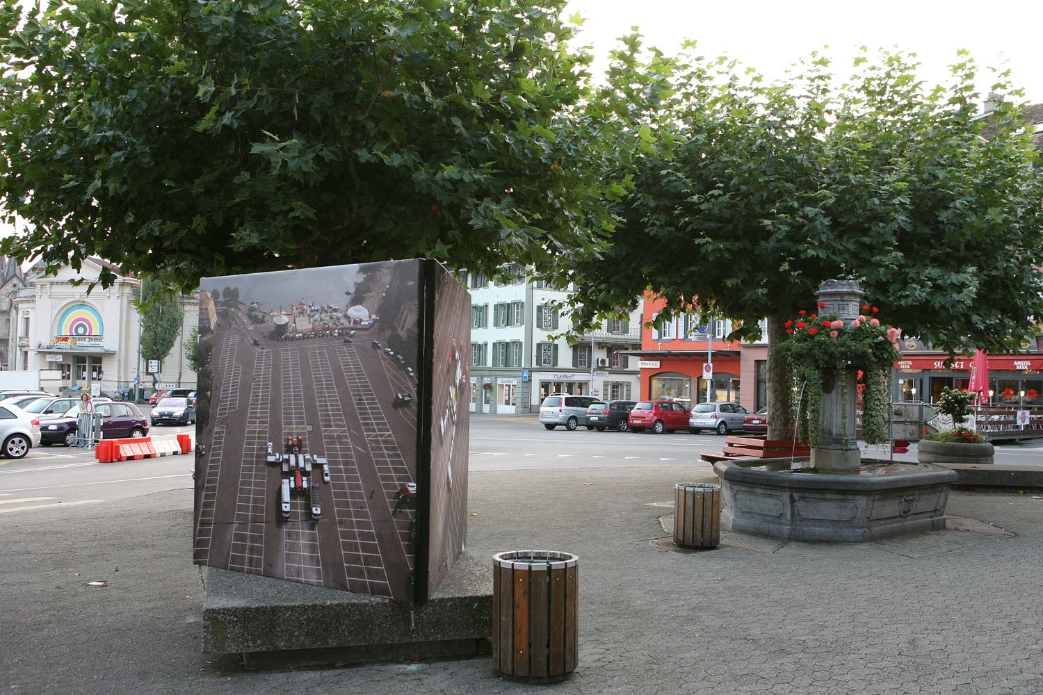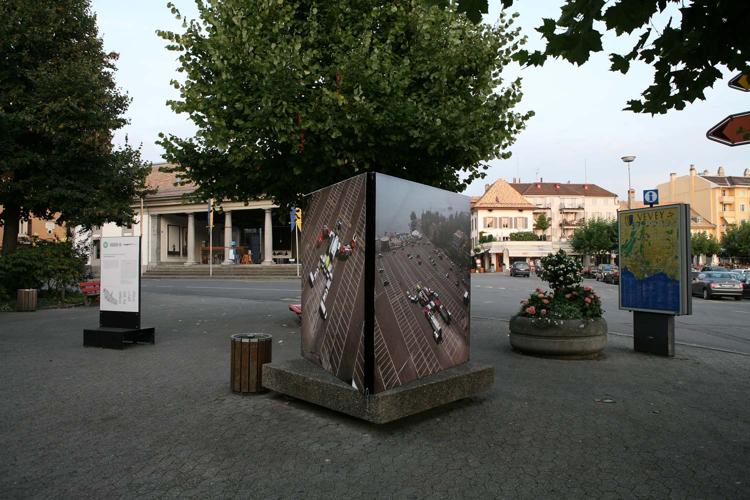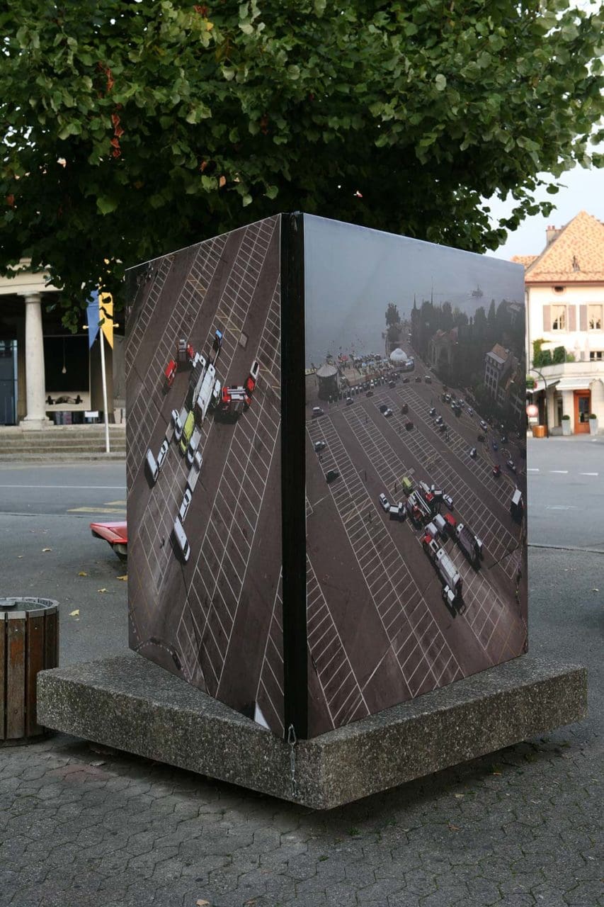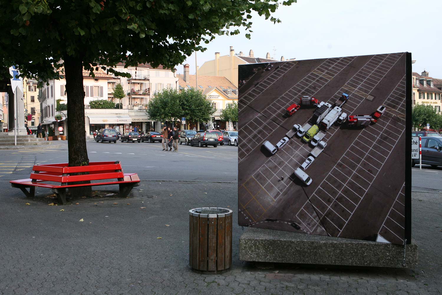 Guillaume Reymond directed his TRANSFORMERS # 01, a large-scale performance inspired by the eponymous cartoon, on the largest car park in Vevey. The artist choreographed various municipal public service vehicles, such as fire trucks, police cars, garbage trucks, road sweepers and ambulances into a real ballet to form gigantic robots observable from the sky and documented by a remote-controlled Zeppelin. During Festival Images, the film of the making-of as well as the photographs of this monumental happening were displayed on the location where the performance took place.