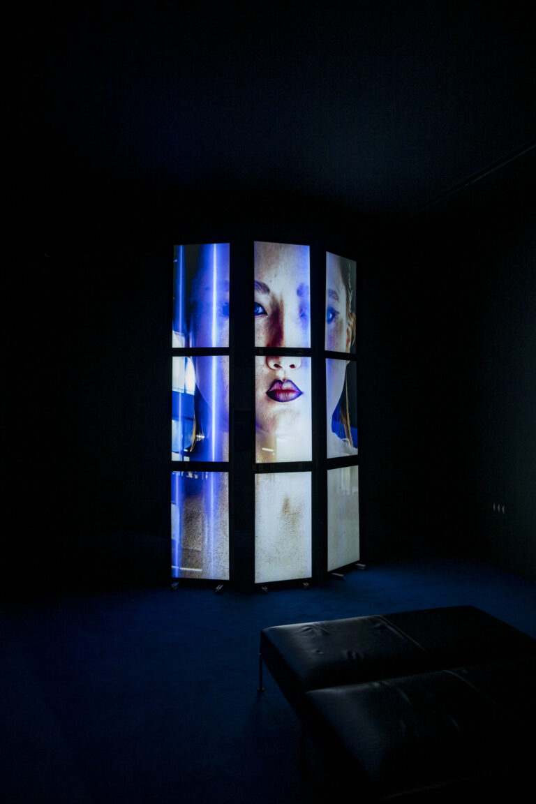 In Le Cinéma, Lea Sblandano unfolds the third part of her immersive installation, conceived as a mental space charged with images. Nine screens on a metal-structure display continuous excerpts from Neijuan: videos, webcam views, avatars, and moments of intimacy intertwine into a dense, shifting visual landscape. Among them appears Kei, a real person and virtual flatmate in Japan, almost constantly connected to a chatroom since the pandemic. He is shown as Lea first encountered him: through a separate screen, suspended between wakefulness and permanent connection. The interface becomes a liberating link, while deepening the distance from the tangible world. Le Cinéma brings together the key themes of the artist’s practice: connected solitude, fragmented presence, and multiple identities. This live connection reminds us that Neijuan remains in perpetual motion, anchored in an always-online world.