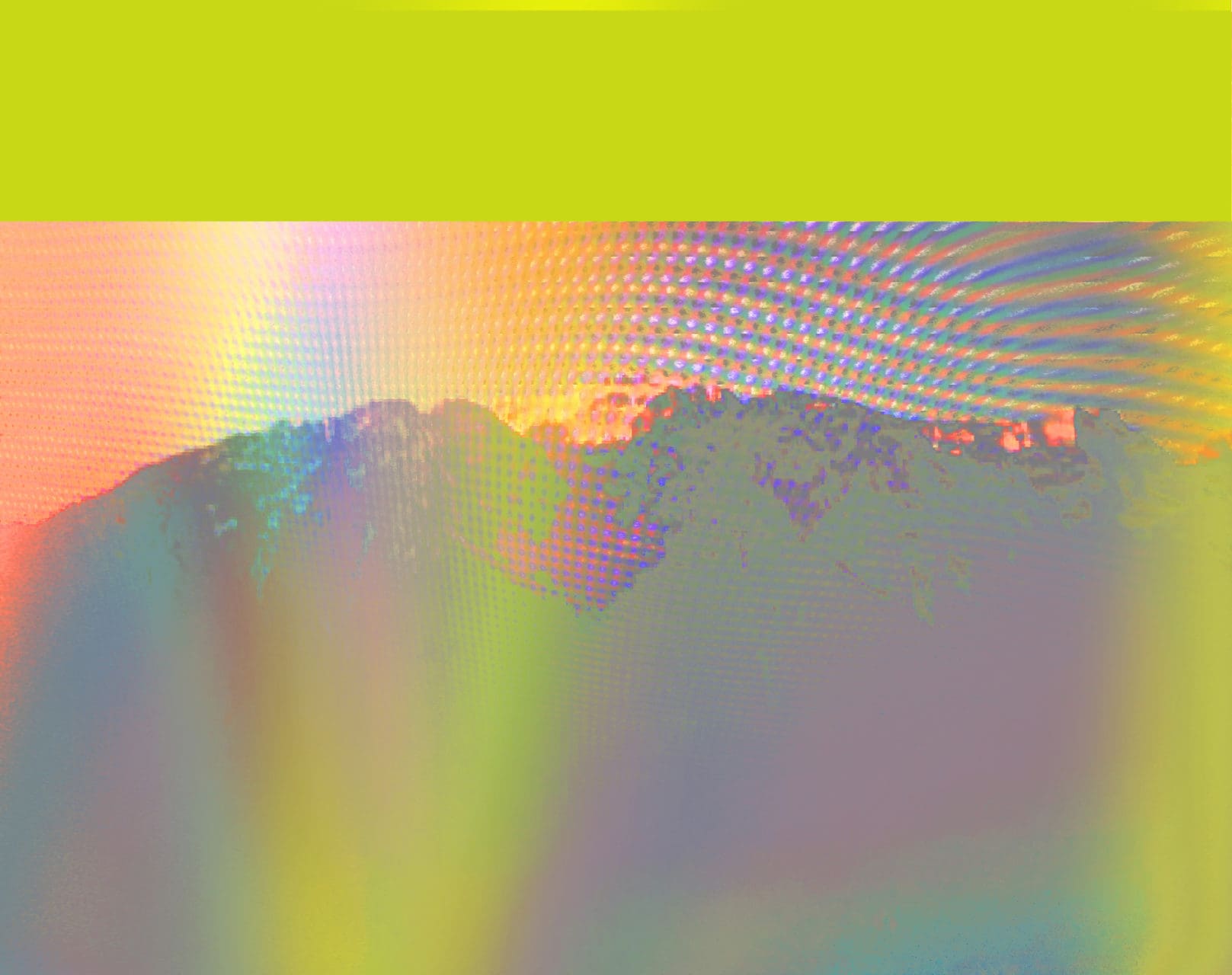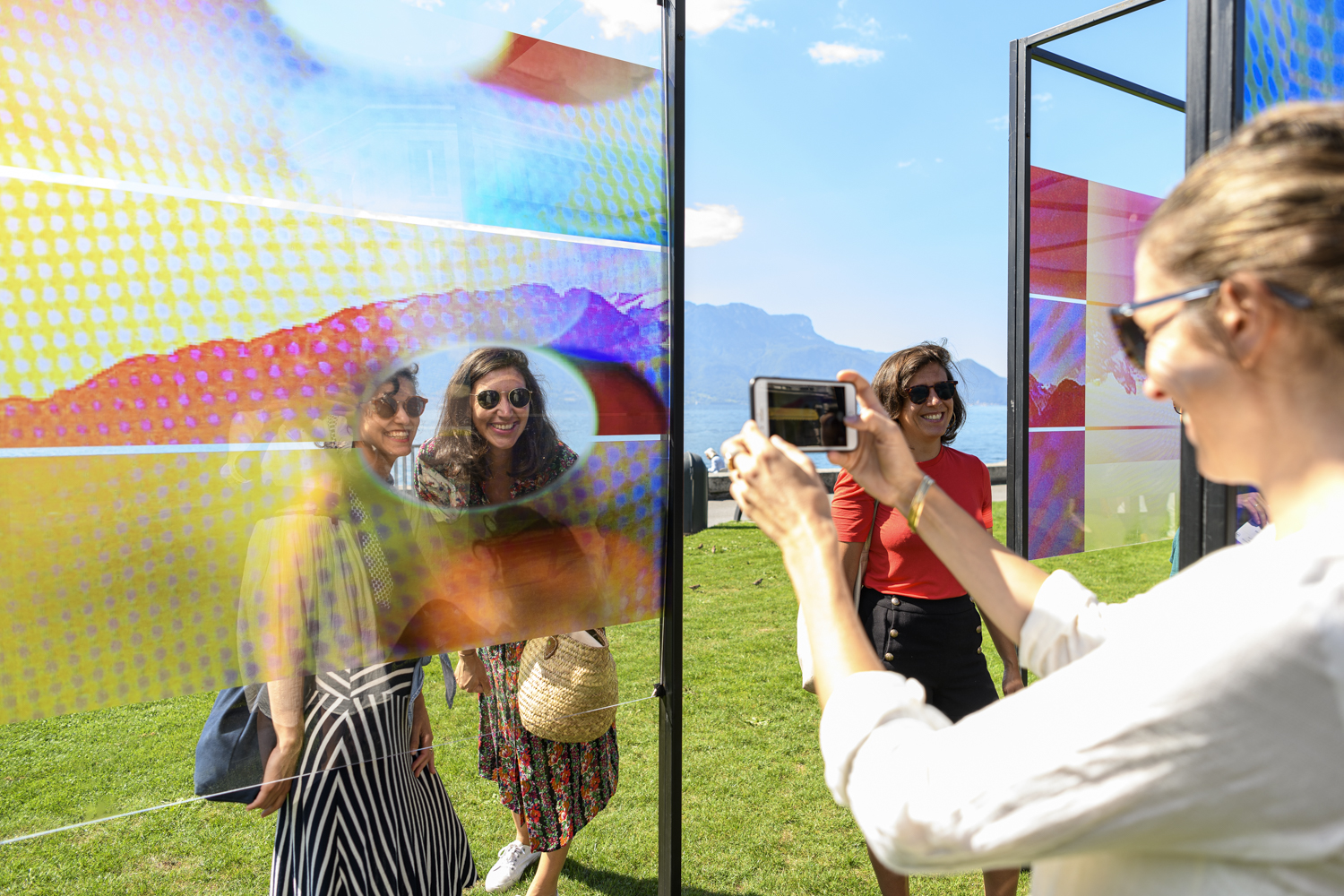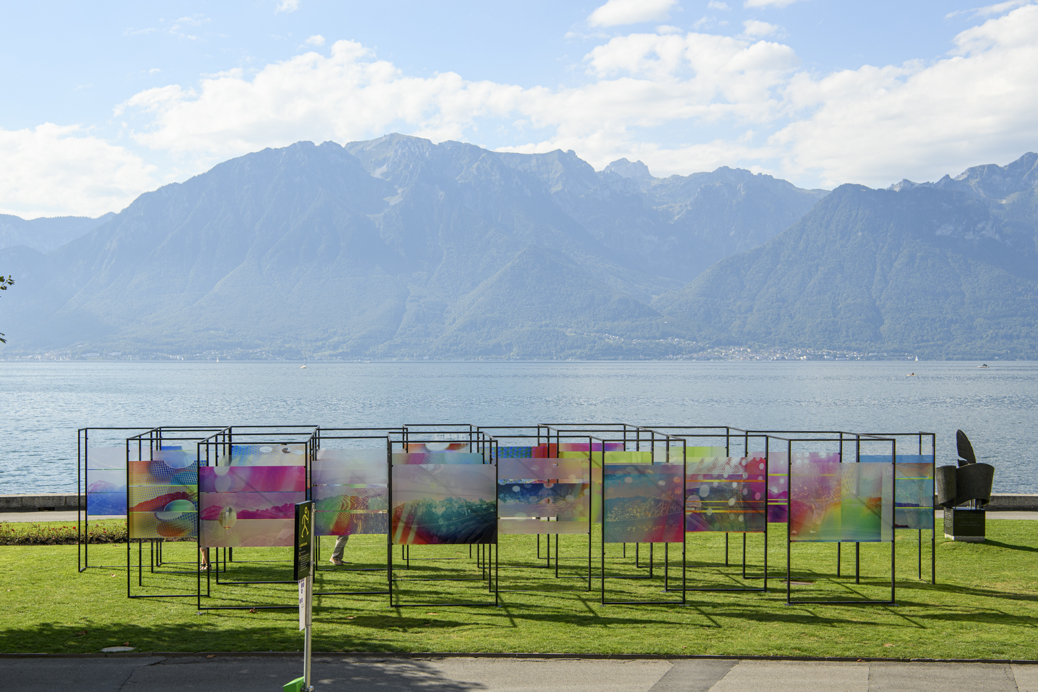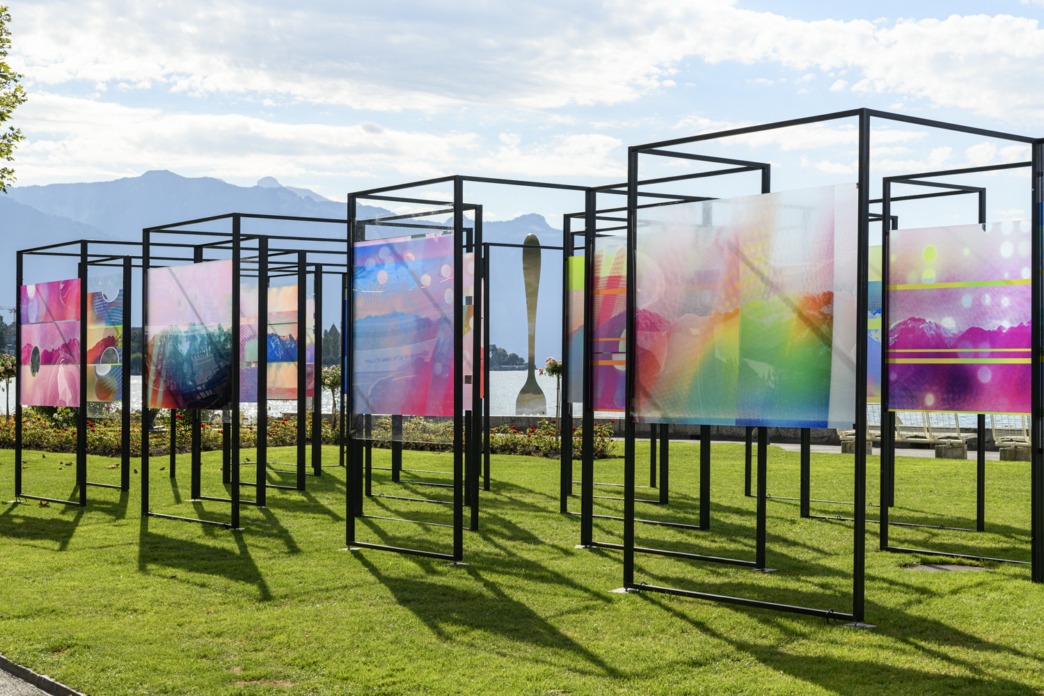 We spend more and more time each day glued to a screen. Mobile phones, computers and televisions have become a sort of extension of our being. Penelope Umbrico’s Range : of Mount Grammont is an in-situ representation of our relationship with screens as both catalysts and a hindrance to contemplation. Her metallic structure, created especially for the Biennale Images Vevey, comprises 22 Plexiglas panels with printed images of the Grammont mountain. The Swiss artist Ferdinand Hodler brought this peak fame, and it is still one of the most photographed views from Vevey’s lakefront. Penelope Umbrico used her own mobile phone to take photos of snapshots she found on social media. She then applied various filters via apps which articially reproduce light leaks. Her installation is placed opposite the mountain so it can be glimpsed through her screens, thus altering the sublime experience of this emblematic landscape.