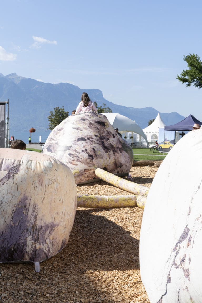 Toying with the evocative power of images, Feu (au lac) rekindles humans’ ancestral fascination with fire. Philippe Durand photographed the infinite fleetness of fire, thereby capturing the primitive shapes of light, going back to the roots of photography. By means of lenticular imagery, a form of pre-digital GIF, he superimposed three different views to restitute the movement of fluctuating flames according to the viewer’s position. Customized for Vevey, the installation rose out of Lake Geneva, echoing Deep Purple’s hit Smoke on the Water, written in the neighboring town of Montreux in 1971. It also hinted at a popular local expression, “the lake ain’t on fire”, meaning that there is no burning rush.