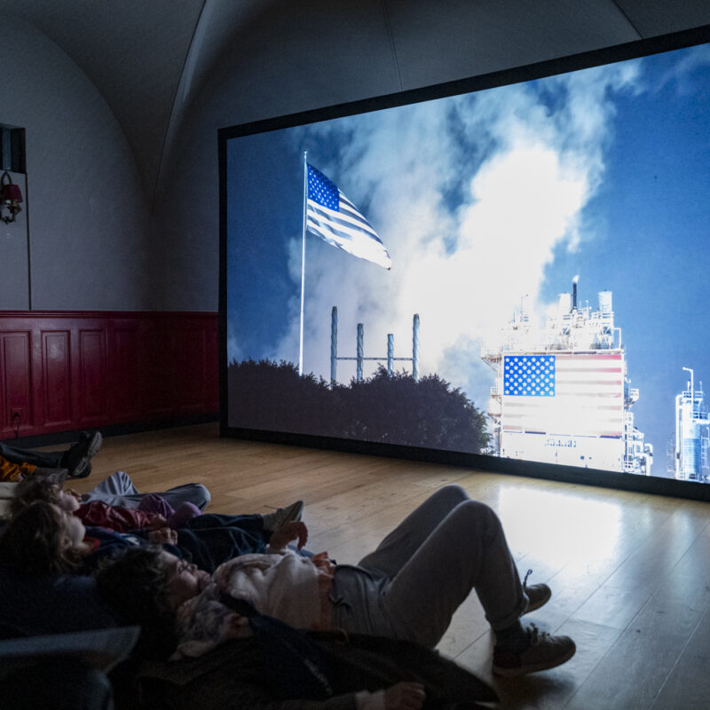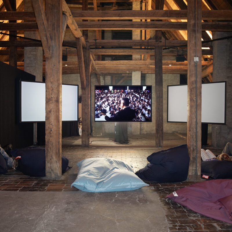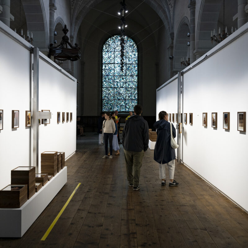 07 / Oliver Frank Chanarin, ‘A Perfect Sentence’. Installation view: Biennale Images Vevey 2024, Switzerland. Commissioned and produced by Forma in partnership with eight institutions across the UK. Commissioned in association with Images Vevey and Amgueddfa Cymru – Museum Wales. Supported by Arts Council England, Art Fund and Outset Contemporary Art Fund. Courtesy and © the artist. Église Satine-Claire (photo © Emilien Itim)