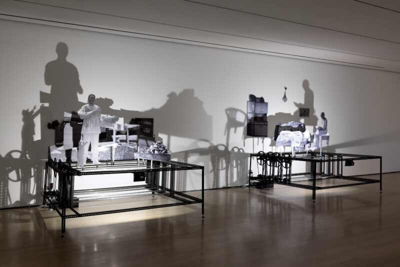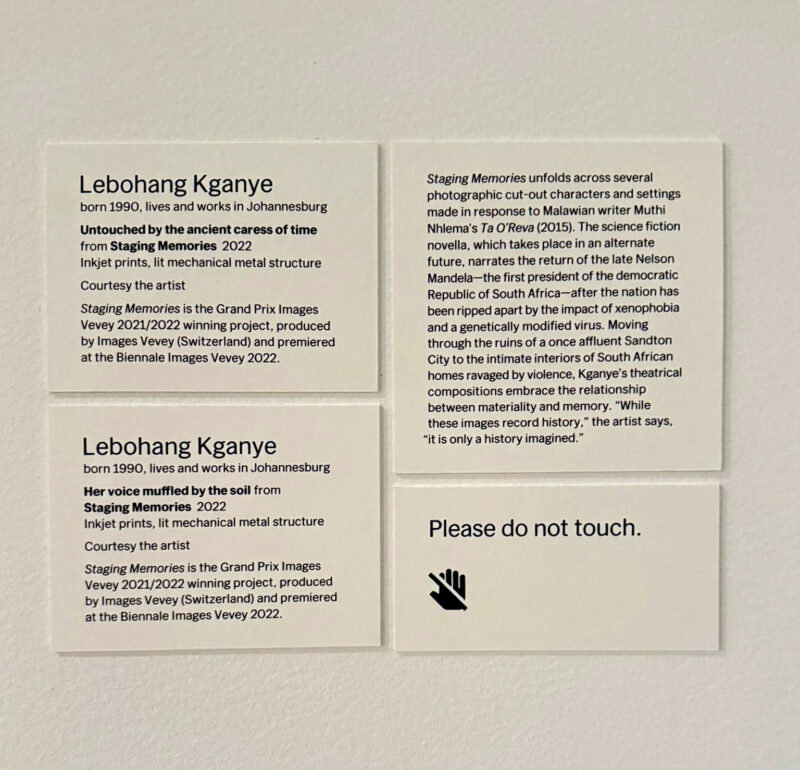 Conçue et produite par Images Vevey à la suite du Grand Prix Images Vevey 2021/2022, l’installation Staging Memories de Lebohang Kganye articule photographie, collage et mise en scène sous la forme de grandes machines visuelles en mouvement : un dispositif cinétique dont la précision d’assemblage et la synchronisation des éléments relèvent d’une véritable prouesse technique, comme un hommage à l’horlogerie suisse, alliant précision, mécanique et esthétique.