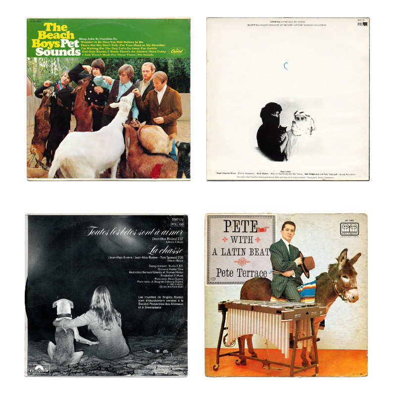 Pet Sounds is an installation featuring vinyl record sleeves of musicians alongside animals. Inspired by the Beach Boys’ 1966 album, Alberto Vieceli collected 320 record sleeves from around thirty countries. The Beatles on horseback, Brigitte Bardot with her cat, Michael Jackson with a tiger or Patti Smith with doves on her hands: the portraits are as bizarre as they are touching. Artists often pose with their pets, adding a personal touch to the album covers. Vieceli’s collection of LPs and 45s from 1955 to 2019 highlights their similarities and reveals a recurring marketing strategy by record companies.. Pet Sounds humorously combines wildlife and glamorous portrait photography, offering a unique experience for music lovers and fans of vernacular imagery.