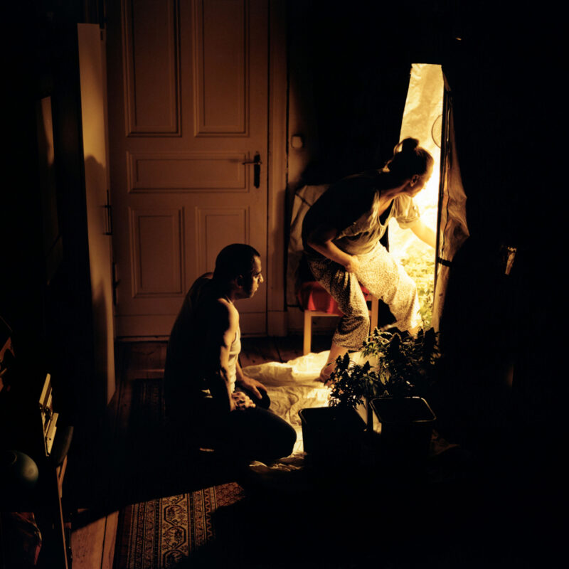 « Notre lit se transforme en un espace interstellaire où mère, père et enfant orbitent les uns autour des autres », écrit Wezel. « Reliés par une force gravitationnelle invisible, leurs trajectoires se réajustent et une nouvelle forme de proximité émerge. »